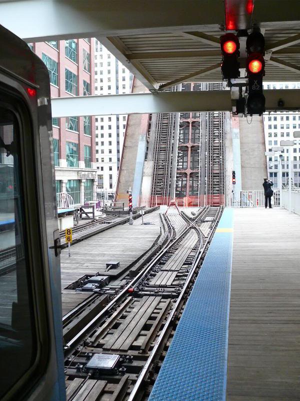 シカゴ、ウェルズストリート橋の跳ね上がった状態。軌道が壁のようにそびえ立つ